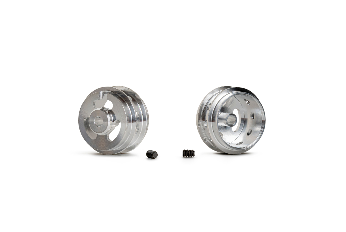 Aluminum 16.5x9.75x1.5mm wheels, M2 grub, double shoulder drilled channel, (2x)